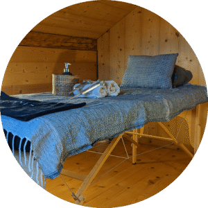 Pour une expérience de bien-être alpin avec une immersion en pleine nature nature, par beau temps, le salon de massage est en plein air au coeur de la forêt, à flan de montagne, sur la terrasse de la Grangette.